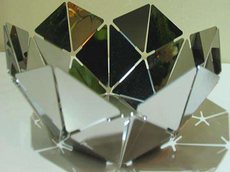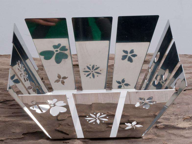 利用不锈钢激光切割机在不锈钢上切割出扇形或四边形,并层层划线,再经过折弯处理即可得到以下形状的金属果盘。